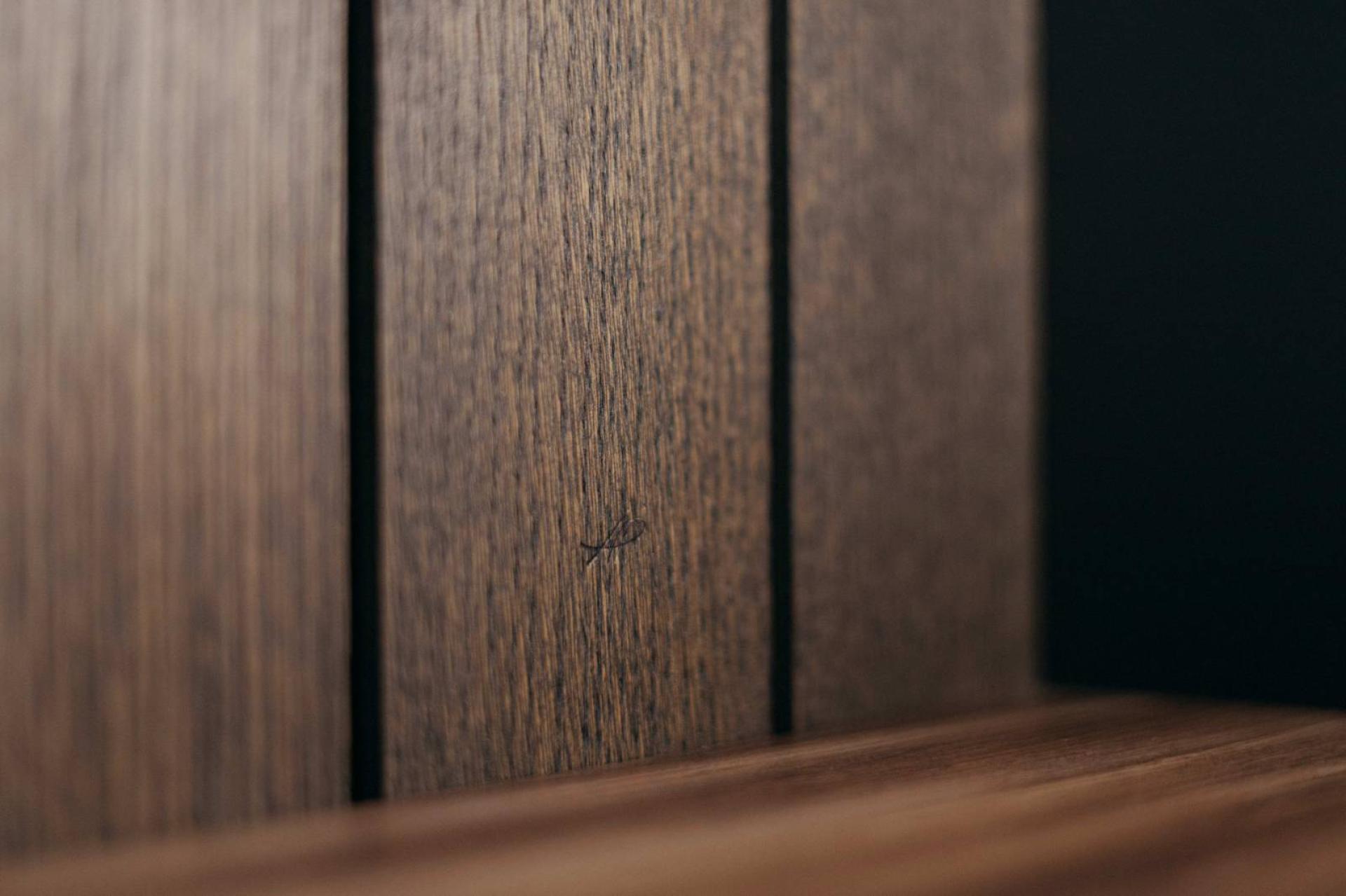 Fabriqué par Antoine Perdrieau, ébéniste à Vindry sur Turdine à côté de Lyon, ce projet incarne parfaitement l’essence du design contemporain. L’utilisation de matériaux variés crée un contraste visuel harmonieux et élégant. Le fond rainuré en medium replaqué en chêne Hubler ajoute une dimension artistique, tout en soulignant la beauté naturelle du bois.