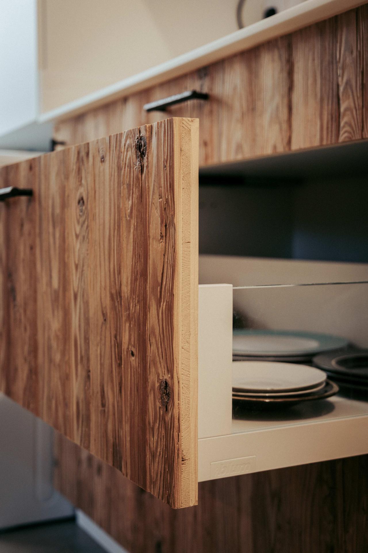 Nous avons privilégié une qualité haute des matériaux comme la résine de synthèse, le panneau 3 PLIS taillé à la hache mais aussi une certaine quincaillerie fonctionnelle et design avec les tiroirs et les inserts en verre mais encore le range-épice.