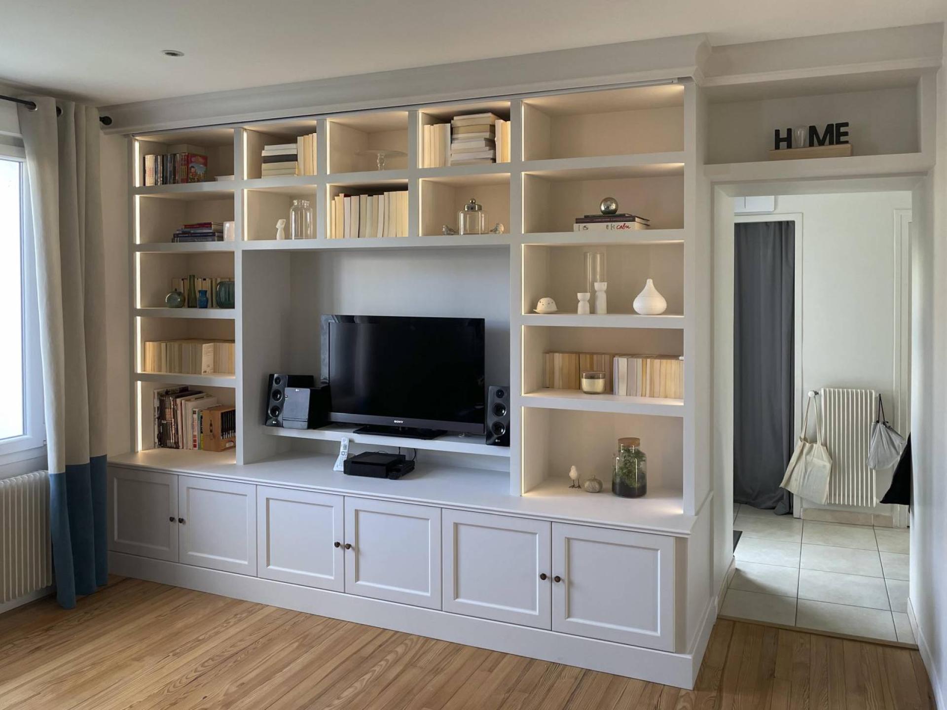 Au premier rendez-vous, notre client avait une idée bien précise de son aménagement pour recevoir livre, TV, multimédia et divers …. Nous avons pris conscience de l’idée et nous avons dessiné leur projet afin de donner dimensions exactes.