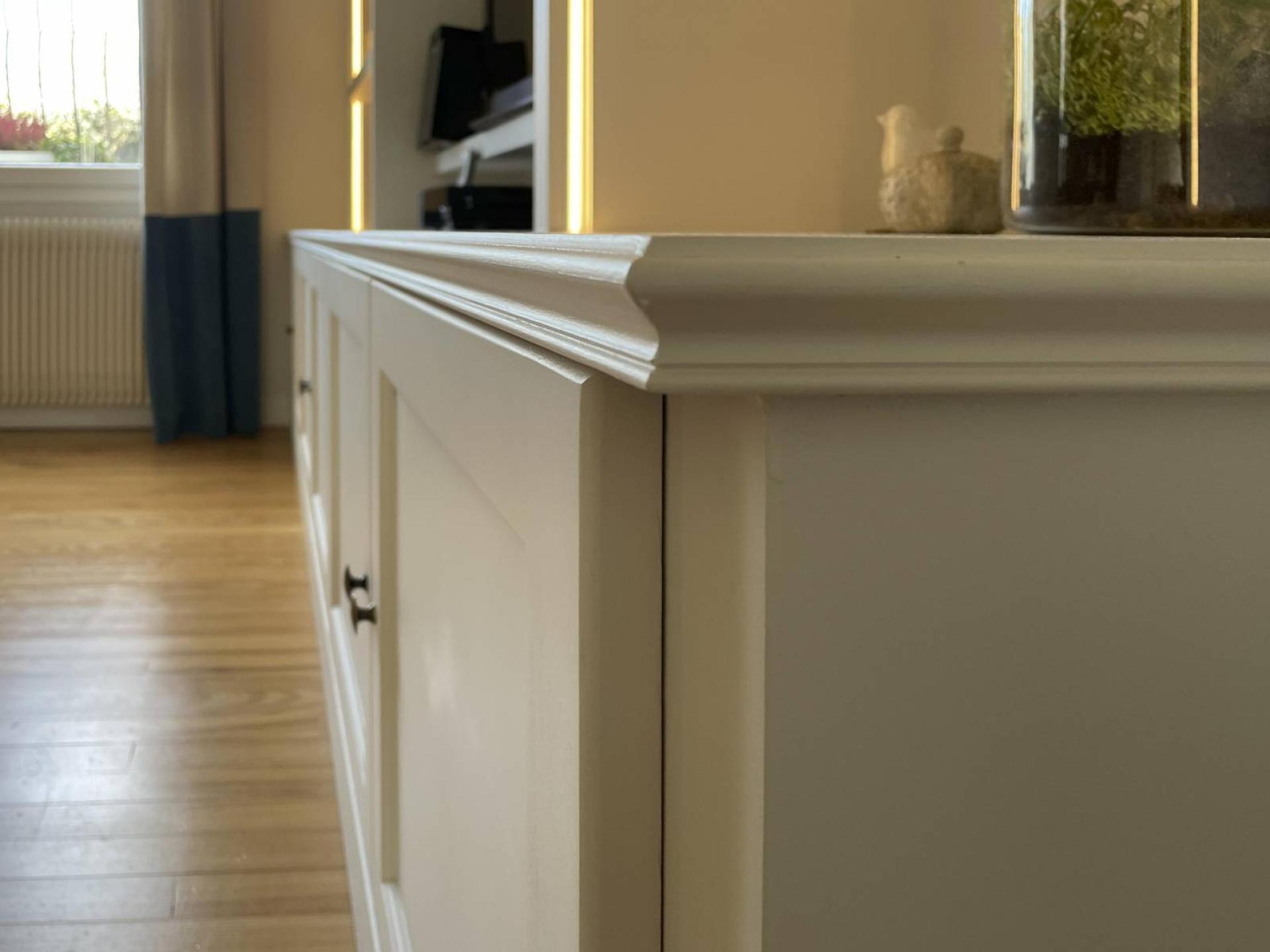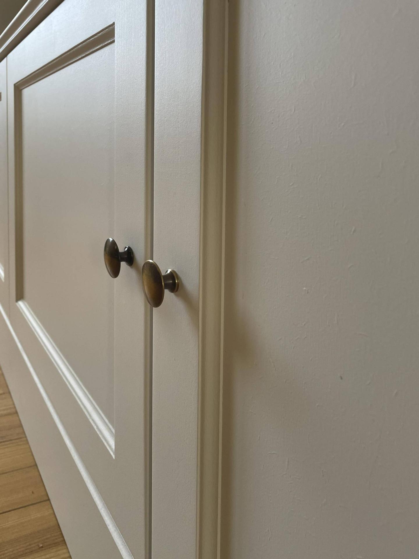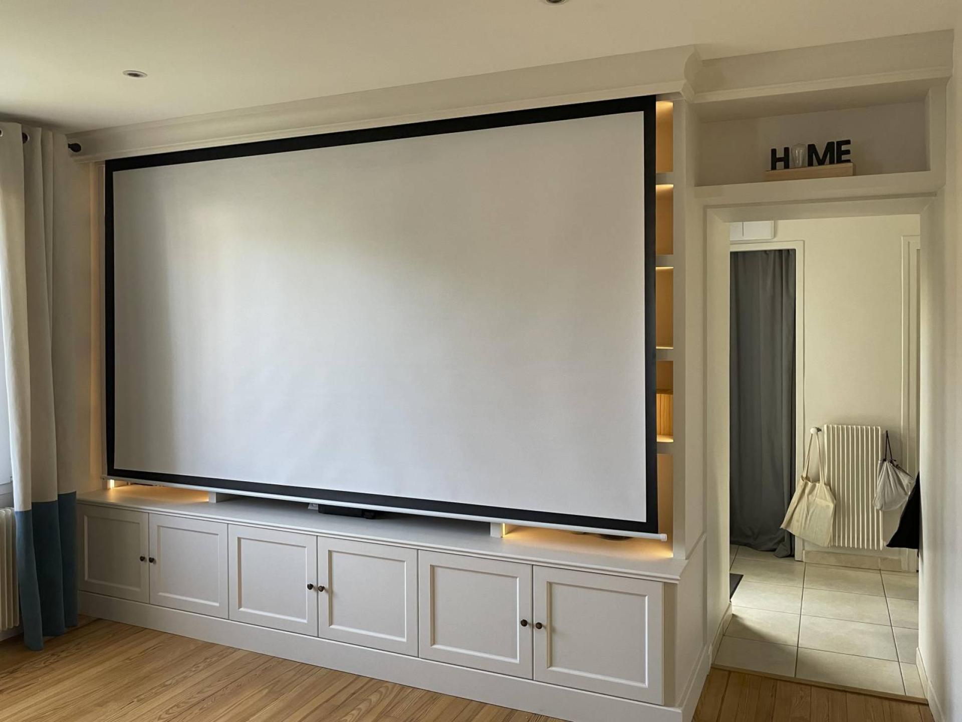 Cet aménagement a été réfléchis en médium peint avec moulure et porte en hêtre massif. La corniche fait office de cache écran vidéo-projecteur. Les boutons anglais prennent toute leur place à coté des moulures dites doucine !