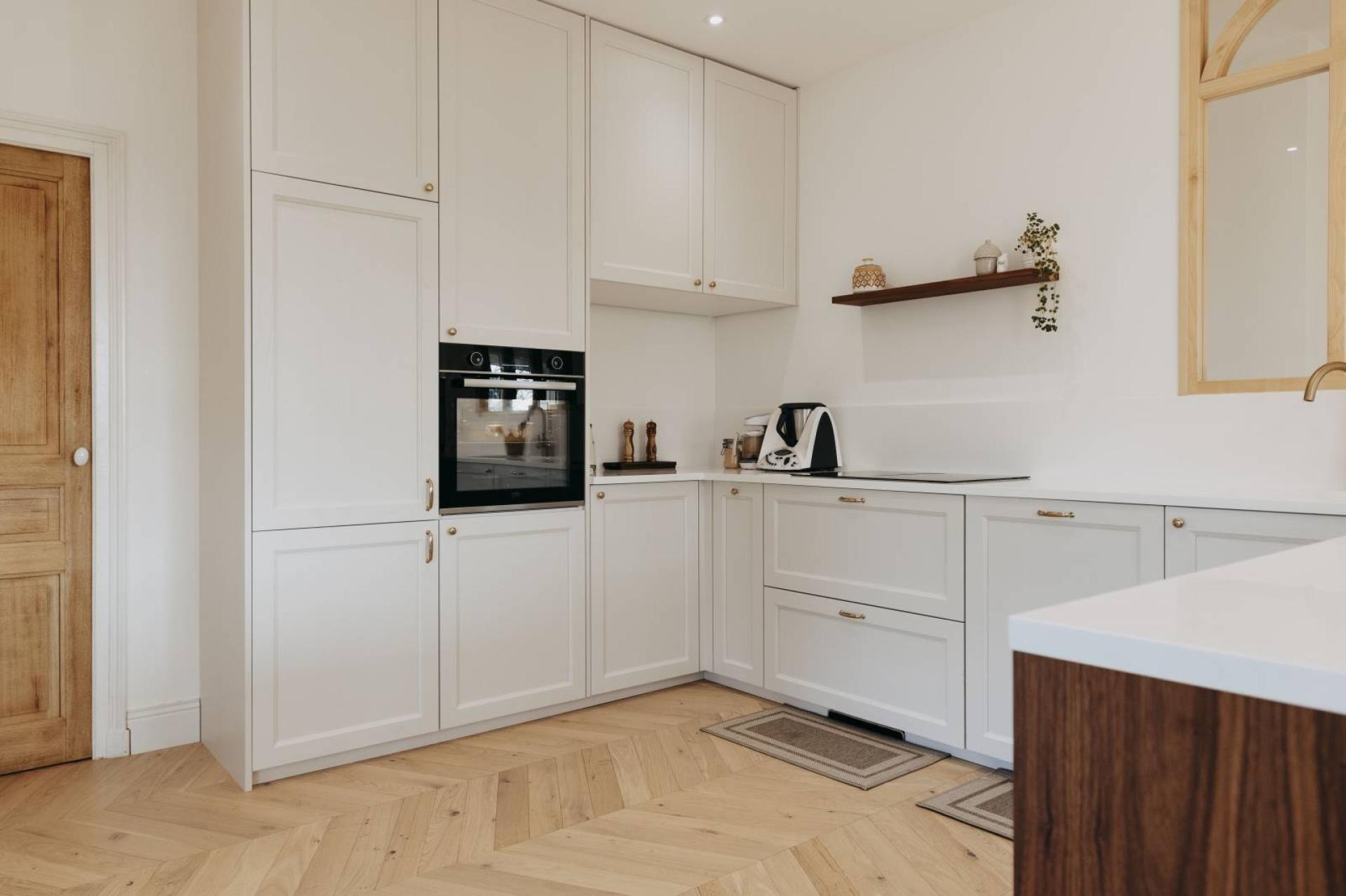 Pensée par Antoine Perdrieau, ébéniste passionné et fondateur de By House, cette cuisine au style anglais à Lyon s’intègre avec raffinement à un appartement de type haussmannien, en harmonie avec un parquet chêne en pointe de Hongrie.
