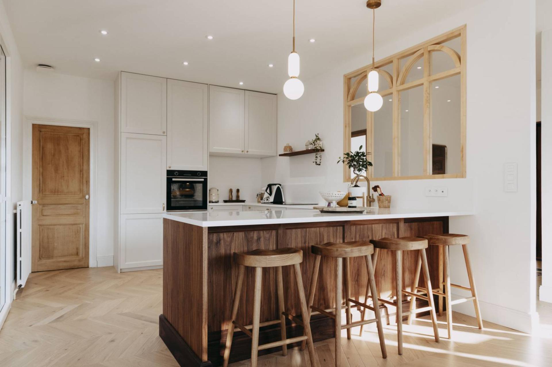 Autre élément phare de cette cuisine sur mesure à Lyon : la verrière en érable sycomore, fabriquée artisanalement dans l’atelier By House. Elle permet à la lumière de circuler tout en structurant l’espace, et donne à la pièce un caractère atypique et authentique.