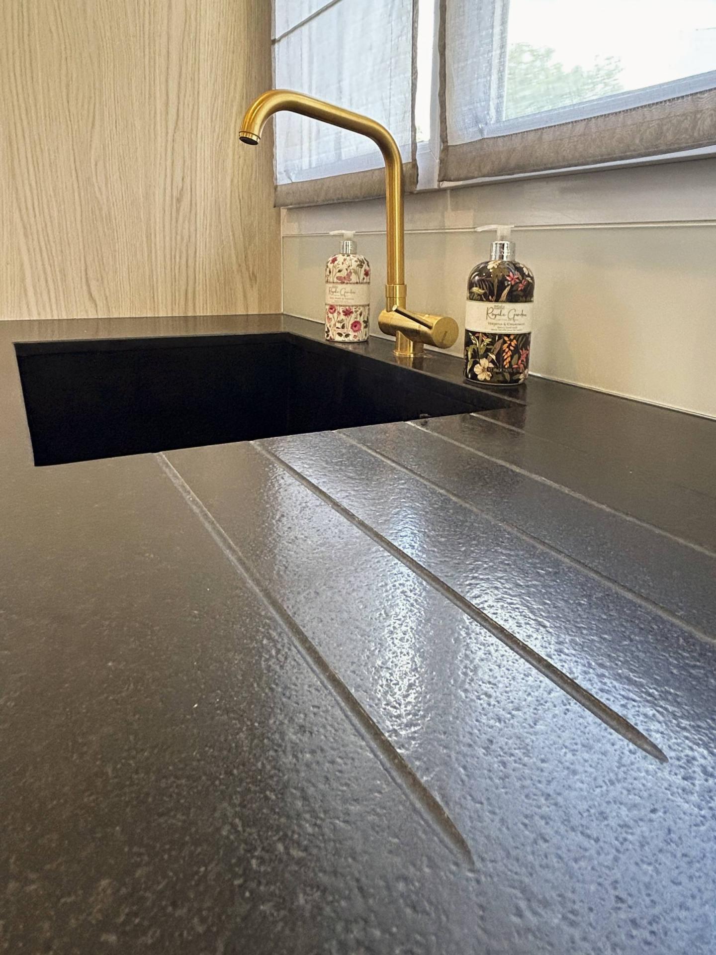 By House a imaginé une cuisine moderne atypique sur mesure à côté de Lyon, en associant design contemporain et matériaux nobles. Le cœur du projet repose sur un plan de travail en granit Zimbabwé, prisé pour sa teinte noire profonde et ses veines argentées. Ce matériau prestigieux assure une durabilité exceptionnelle tout en apportant une touche de luxe discret.