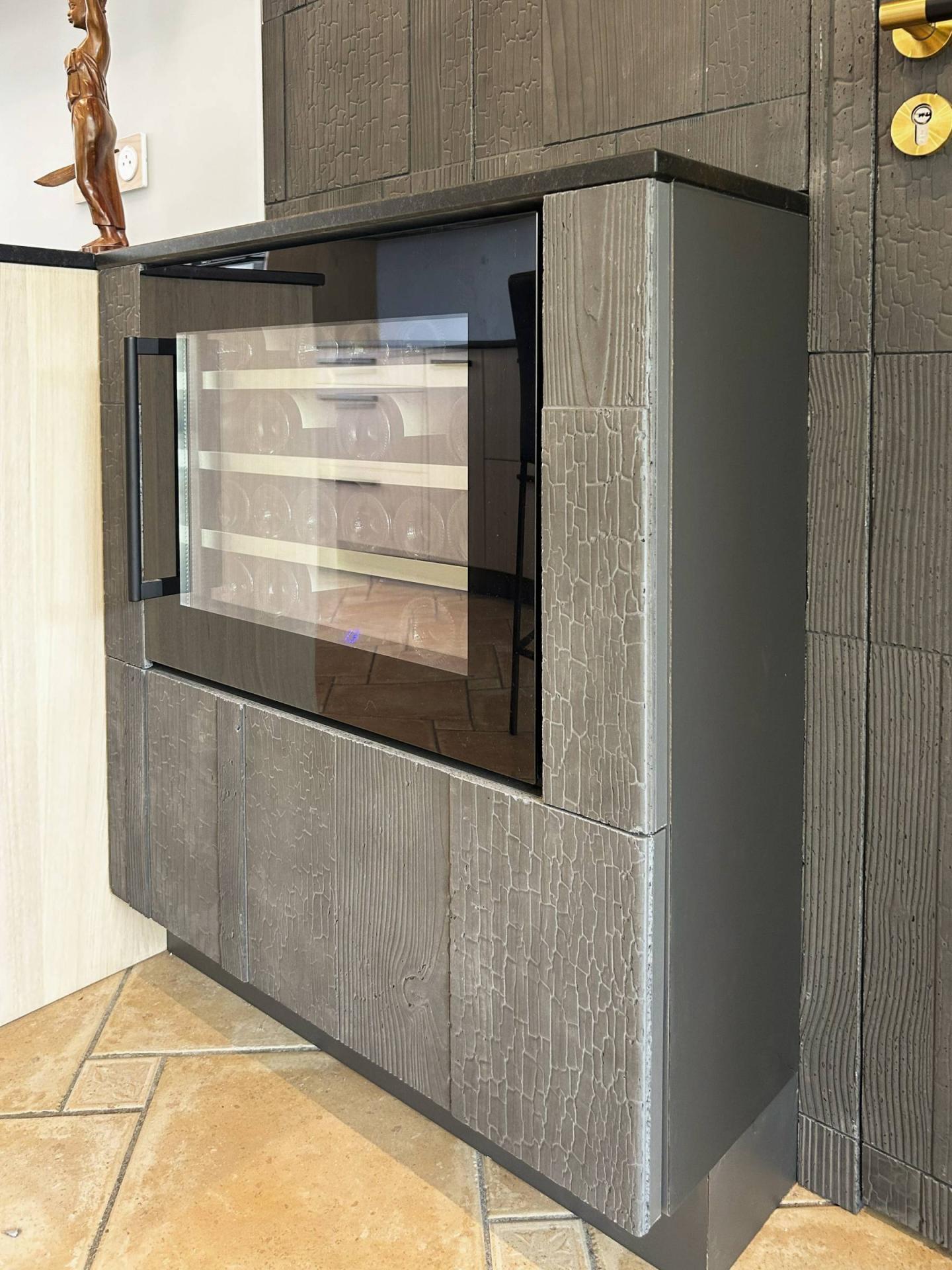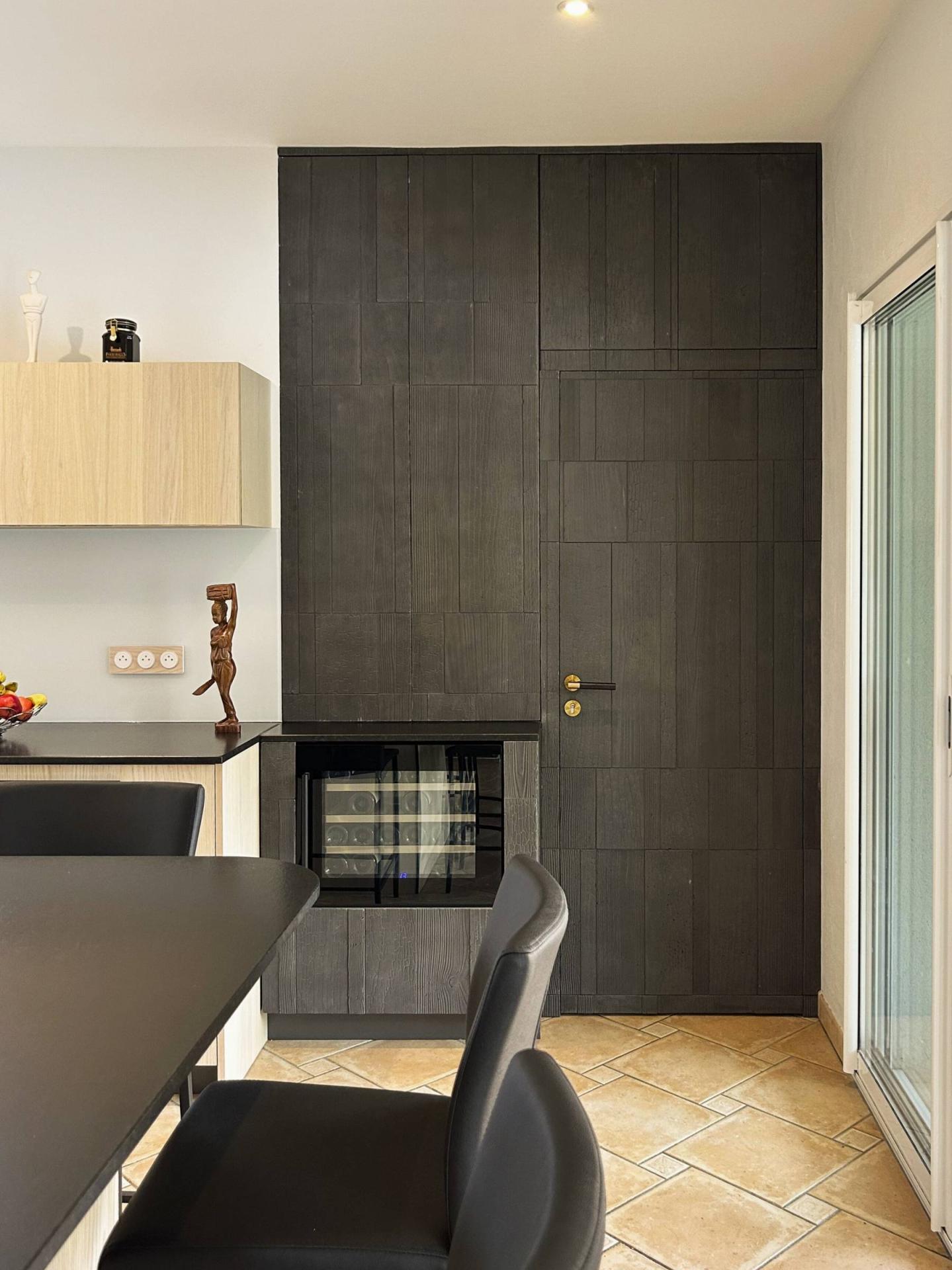 L’une des spécificités de cette cuisine design à côté de Lyon réside dans l’habillage du mur menant au garage avec des panneaux béton LCDA. Ce revêtement crée un contraste élégant avec le bois et le granit, et affirme un style résolument contemporain.
