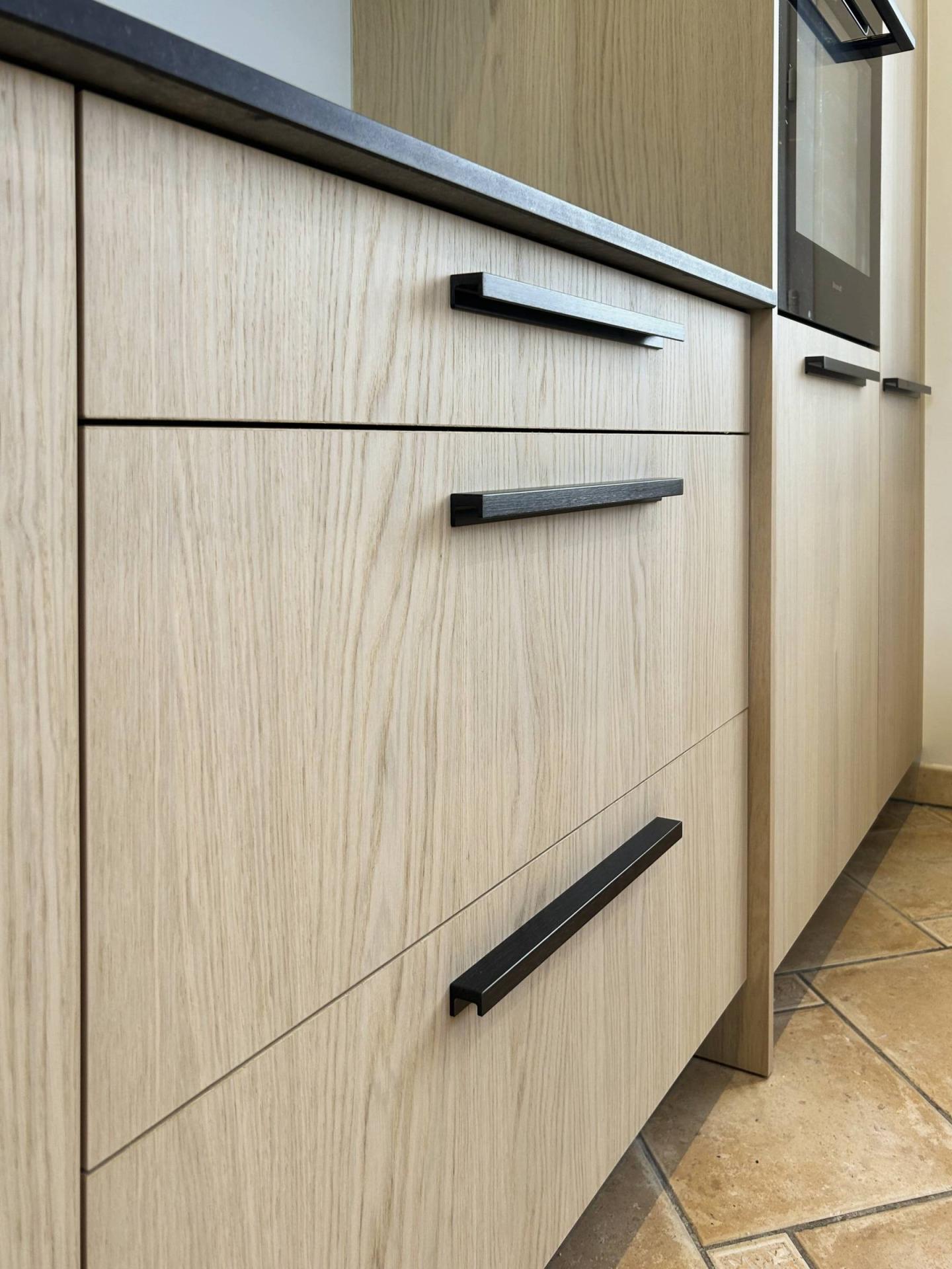 Les façades des meubles sont habillées d’un placage en chêne, offrant une texture naturelle et chaleureuse. Ce choix permet une parfaite continuité visuelle, tout en valorisant un style organique et épuré. L’ensemble donne à la pièce une ambiance accueillante, idéale pour une cuisine familiale ou conviviale.