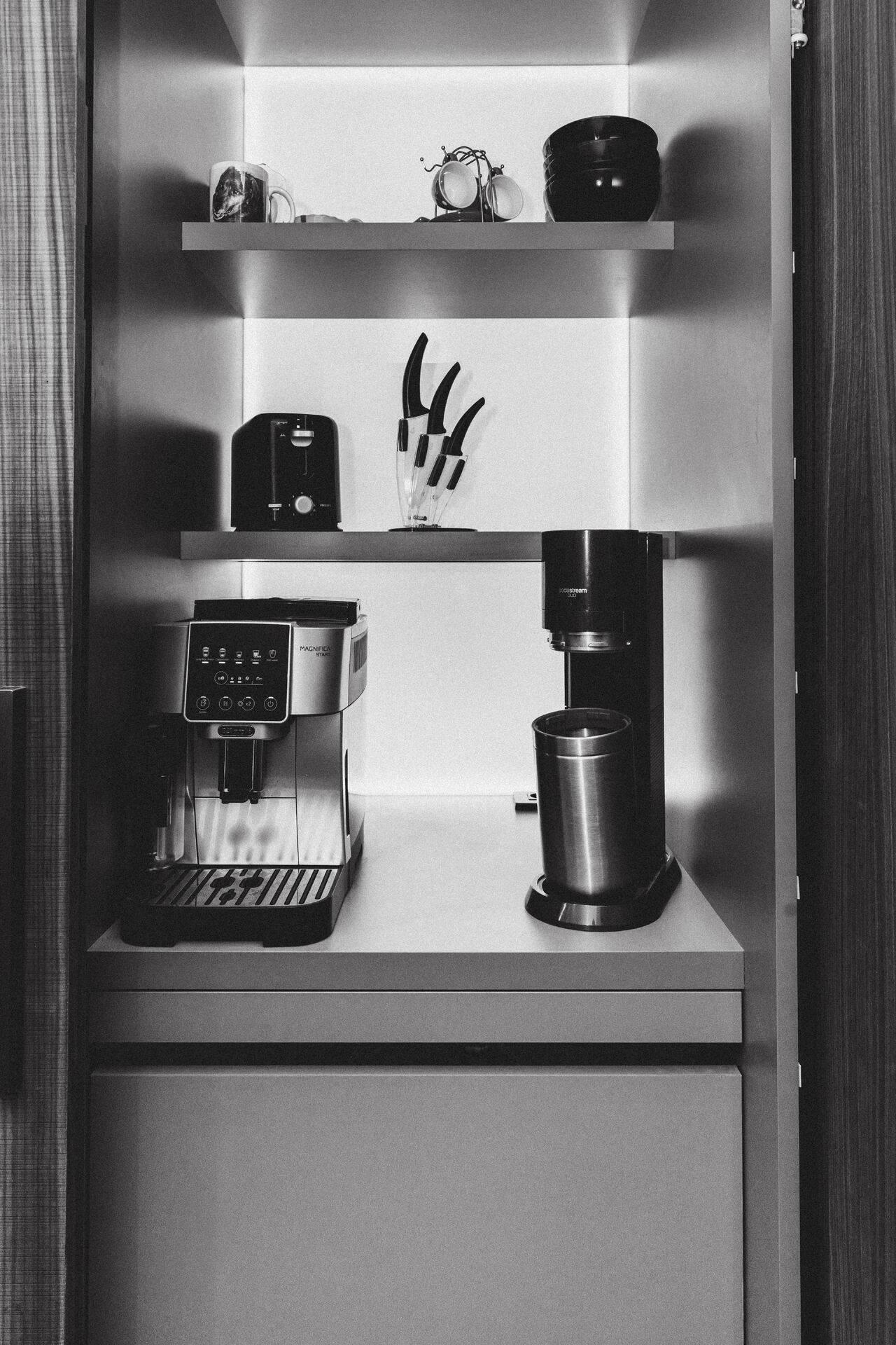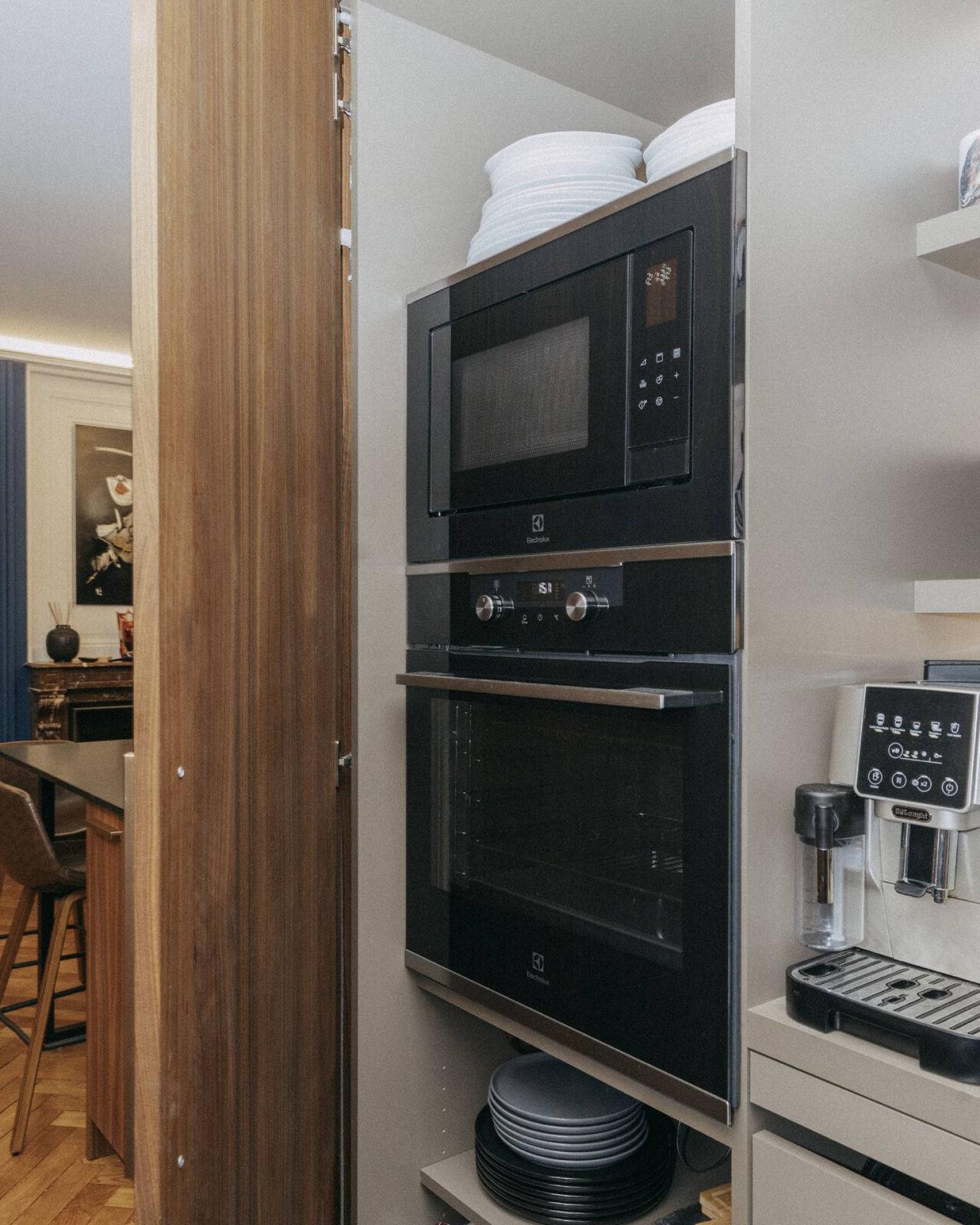 Dans cette réalisation, l’esthétique prime sur la démonstration technologique. L’électroménager, souvent trop visible, se fait ici discret grâce au système Exedra de la maison