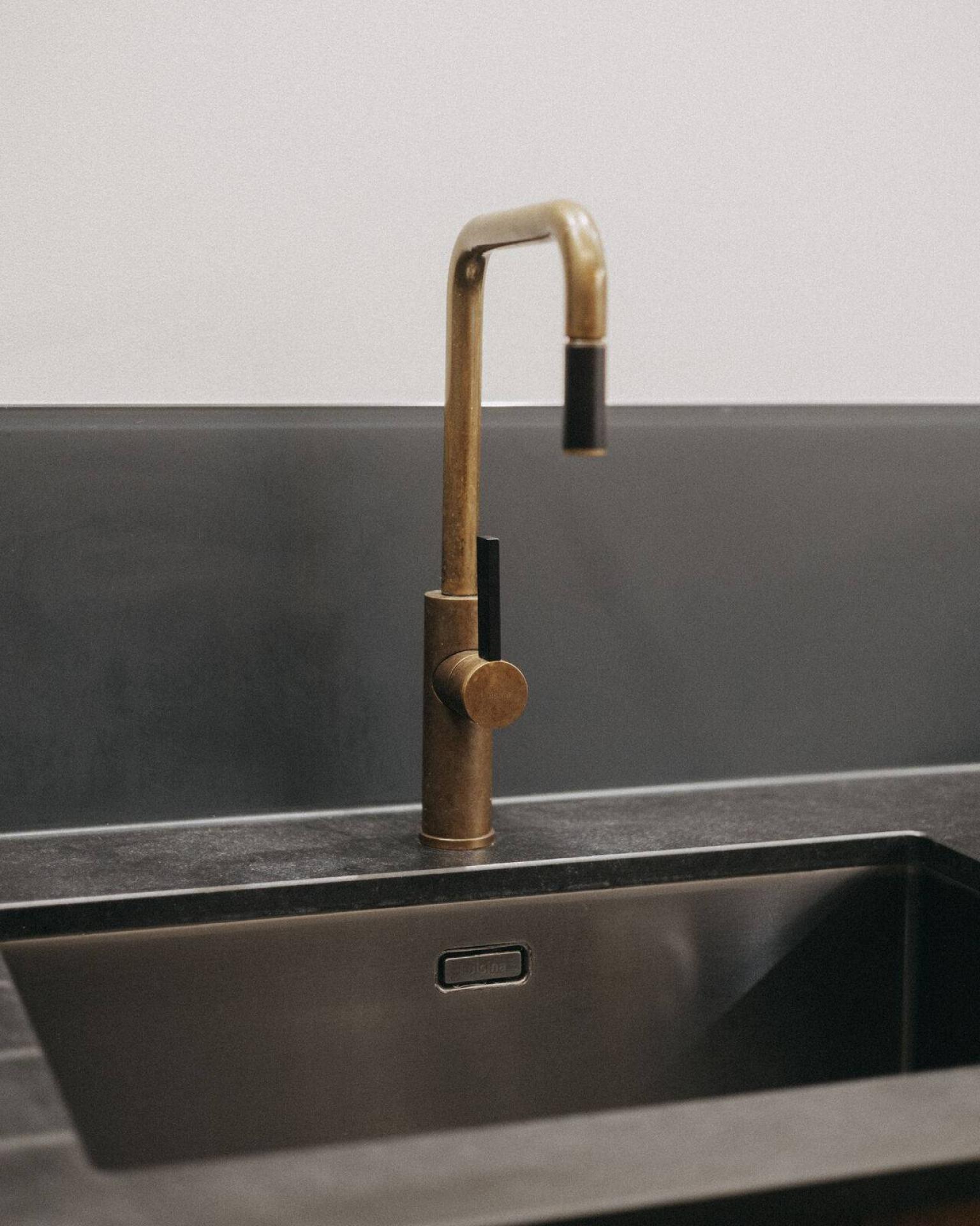 plan de travail en granit noir Zimbabwe et des garnitures en laiton massif signées