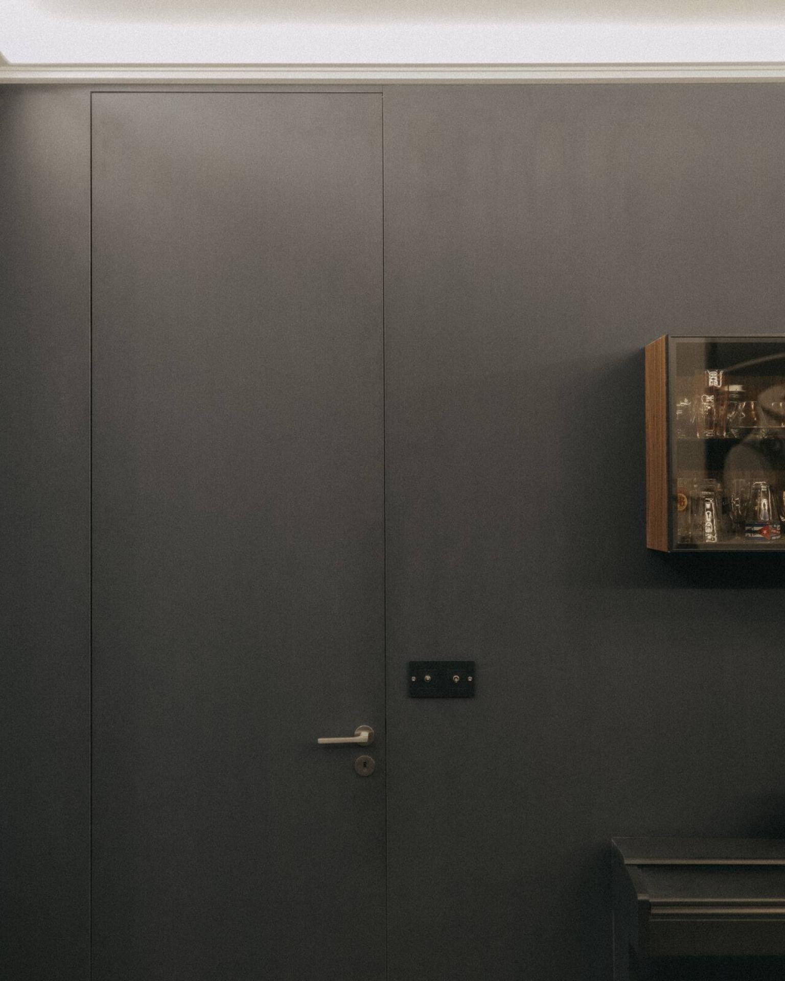 placards tout hauteur, intégrés derrière la corniche, donnent l'impression d'avoir toujours été là, avec des finitions en coupe à 45 degrés pour une continuité visuelle parfaite.