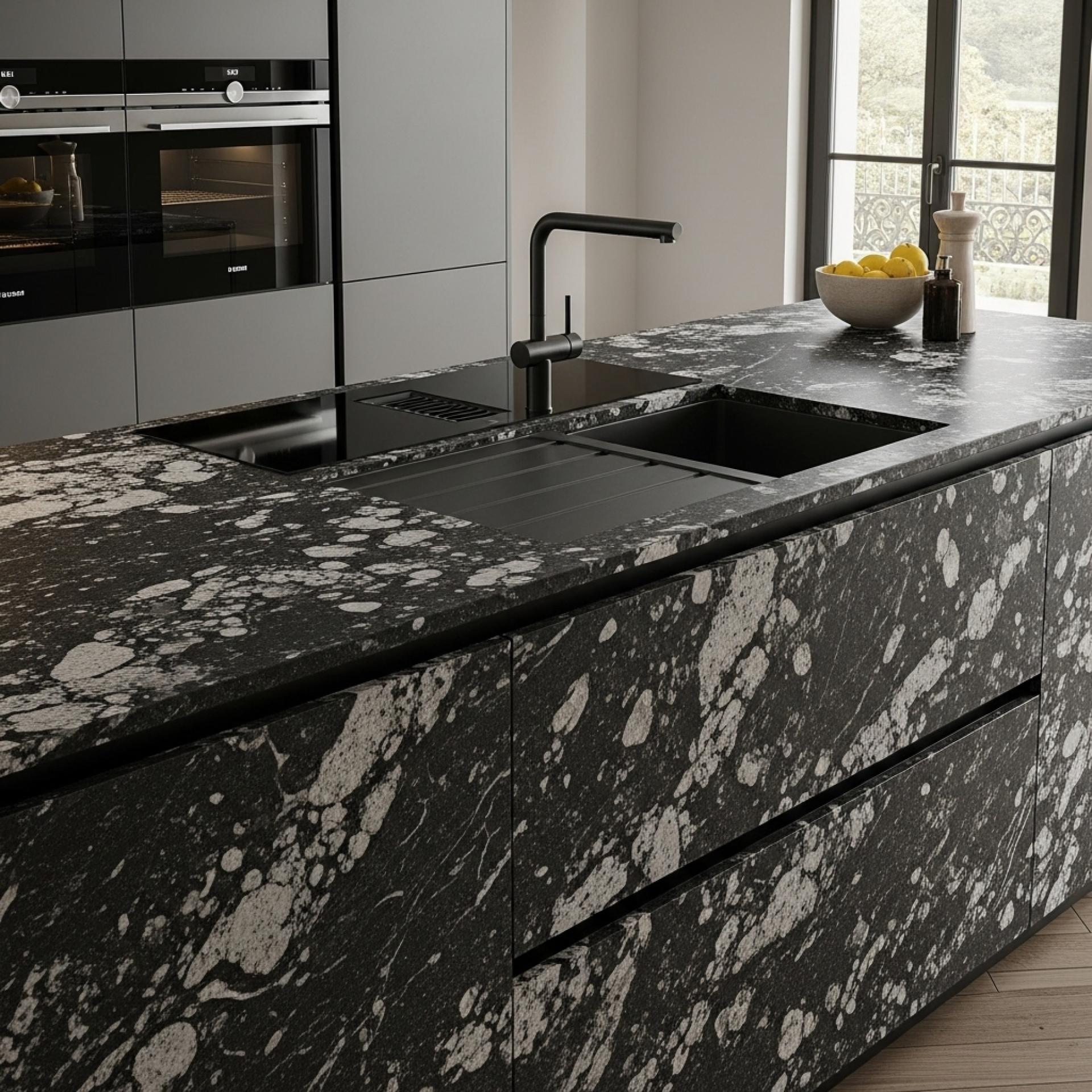 Cuisine moderne haut de gamme sur mesure à Lyon : découvrez le granit noir Zimbabwe finition cuir, l'élégance et la robustesse au cœur de votre villa de luxe. Demandez votre devis personnalisé